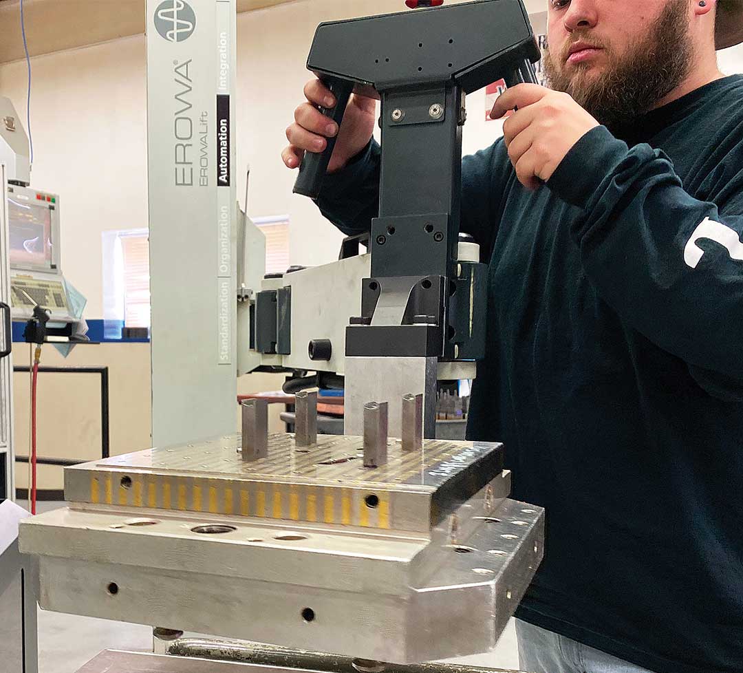 An Industrial Molds operator uses an EROWA Lift to safely lift and position a heavy precision ?xture plate for automated machining set-up.