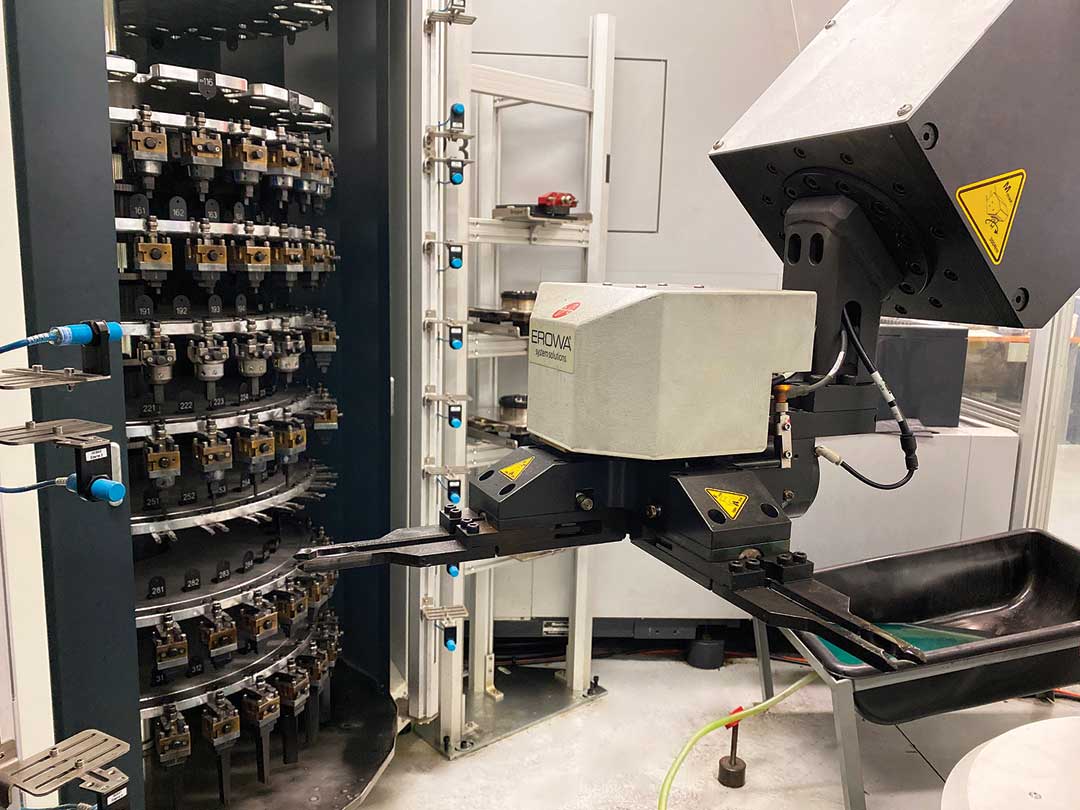 EROWA's double gripper automatically loading and unloading workpieces from a storage carousel for high-efficiency, unattended machining operations.