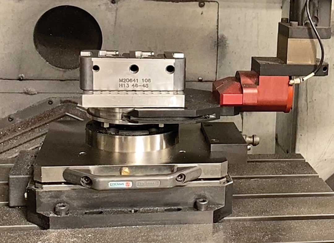 Workpiece clamped on an EROWA ?xture system being automatically loaded inside a CNC machine.