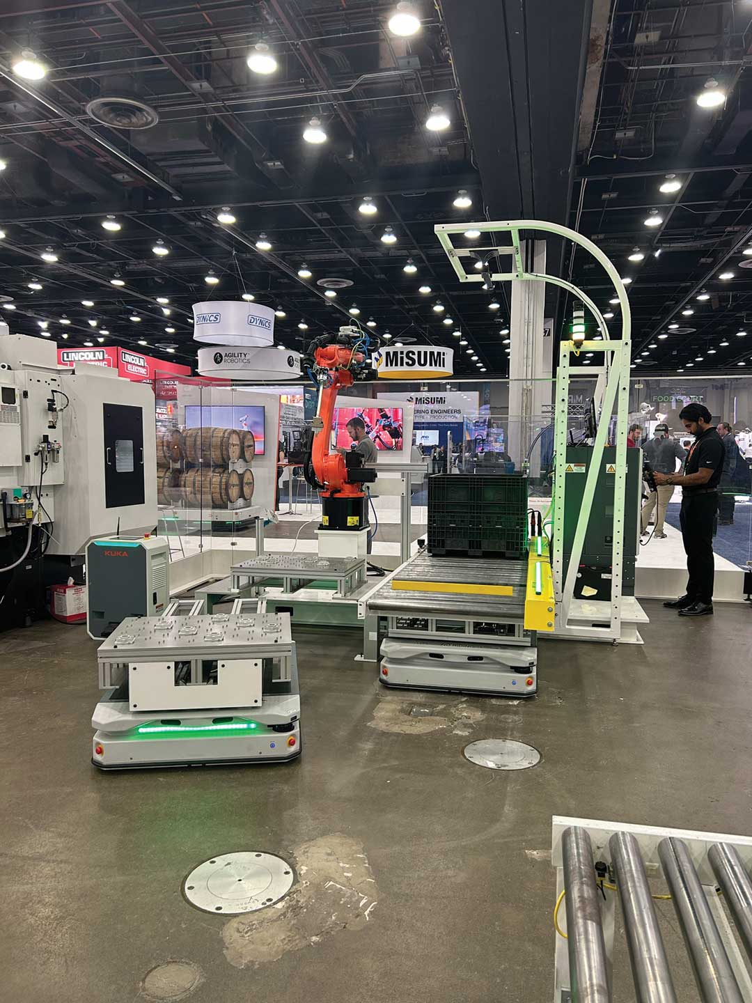 Managed by KUKA's AMR.Fleet software, two KMP 1500P mobile units from KUKA traveling between the part station and machine tending station handled trays and part totes. The tray-handling KMP 1500P uses an integrated elevating module for unloading and loading trays at both robot cells. The tote-handling KMP 1500P incorporates a conveyor module for unloading and loading of totes at both robot cells and at the tote staging area. KMP 1500Ps are differential driven, mobile platforms that navigate autonomously and eliminate the need for predefined routes and rigid processes. KUKA's diffDrive technology enables precise and highly maneuverable movement by independently controlling the speed of two or more wheels on either side of the robot. By varying the relative speed of these wheels, the robot can move forward, backward, turn in place, or navigate complex environments with smooth and efficient motion. This drive system enhances agility, making KUKA mobile platforms well-suited for dynamic industrial applications such as autonomous material transport and flexible manufacturing. Banner brand sensors, IO-Link and wireless communication technology is used through the cell for discrete control and monitoring of a variety of the system functions.