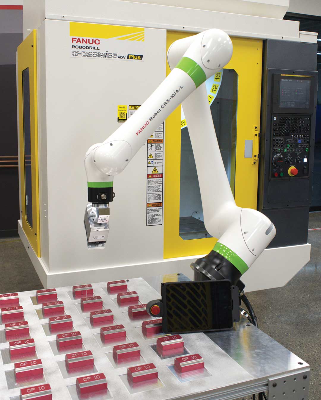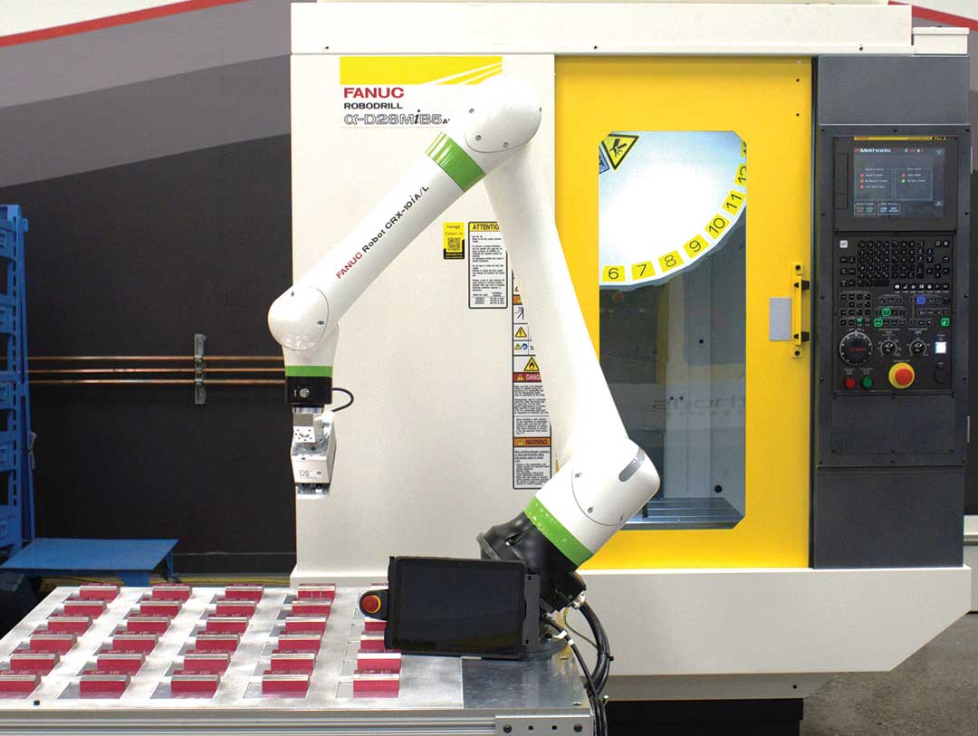 A collaborative system engineered for small- and medium-sized shops, the Sidekick offers light, unattended machining on the FANUC RoboDrill, supported by a FANUC CRX-10iA/L robot mounted to a standardized table design that holds up to 30 workpieces.
