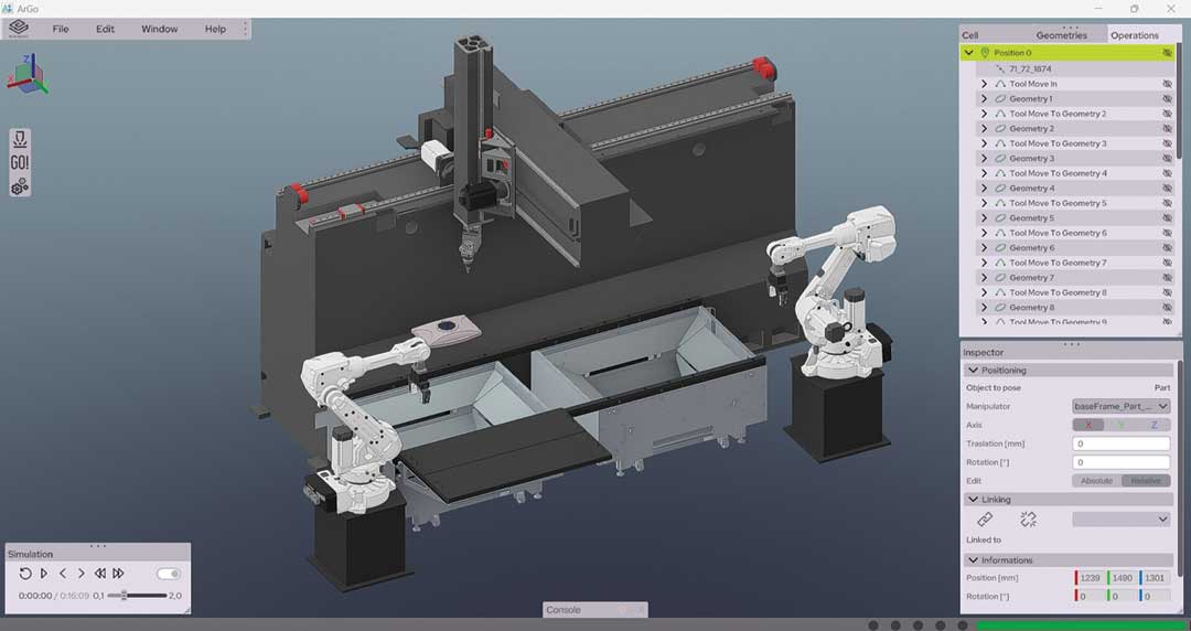 BLM GROUP has simplified use of ArGo through an advanced human-machine interface that supports programming for the entire cell, including the cutting machine and the positioning robot. This flexibility allows users to switch cells to process the same part or multiple parts within a single cell. With ArGo, users can easily create a digital twin of the physical machine configuration in a virtual environment. Each machine will have a configuration file that provides the actual location of various devices within the workspace, enabling a precise digital representation of the physical system.
