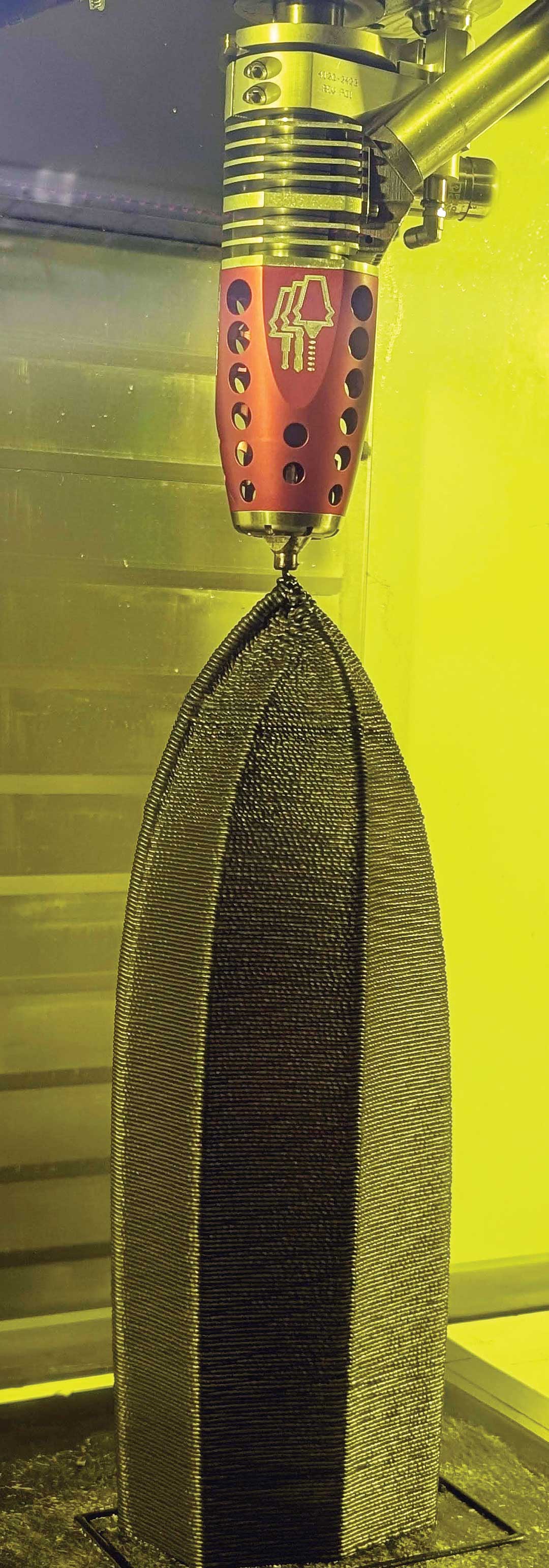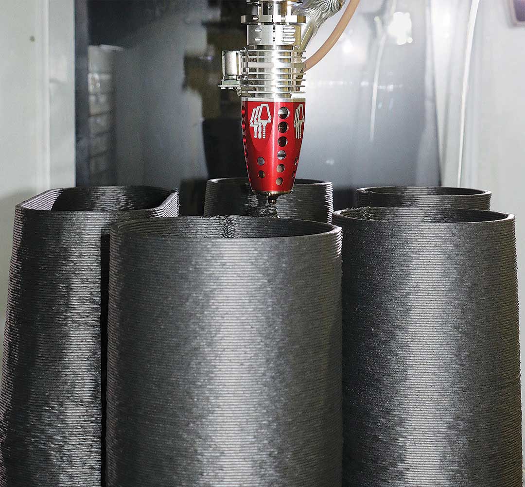 The AMBIT XTRUDE, mounted in a CNC spindle, printed these tubular parts from pellet feedstock made of ABS with carbon fiber reinforcement. The parts weighed 23 lbs. and were printed in 2 hours and 44 minutes. These parts were assembled into a structure 8.2' high.