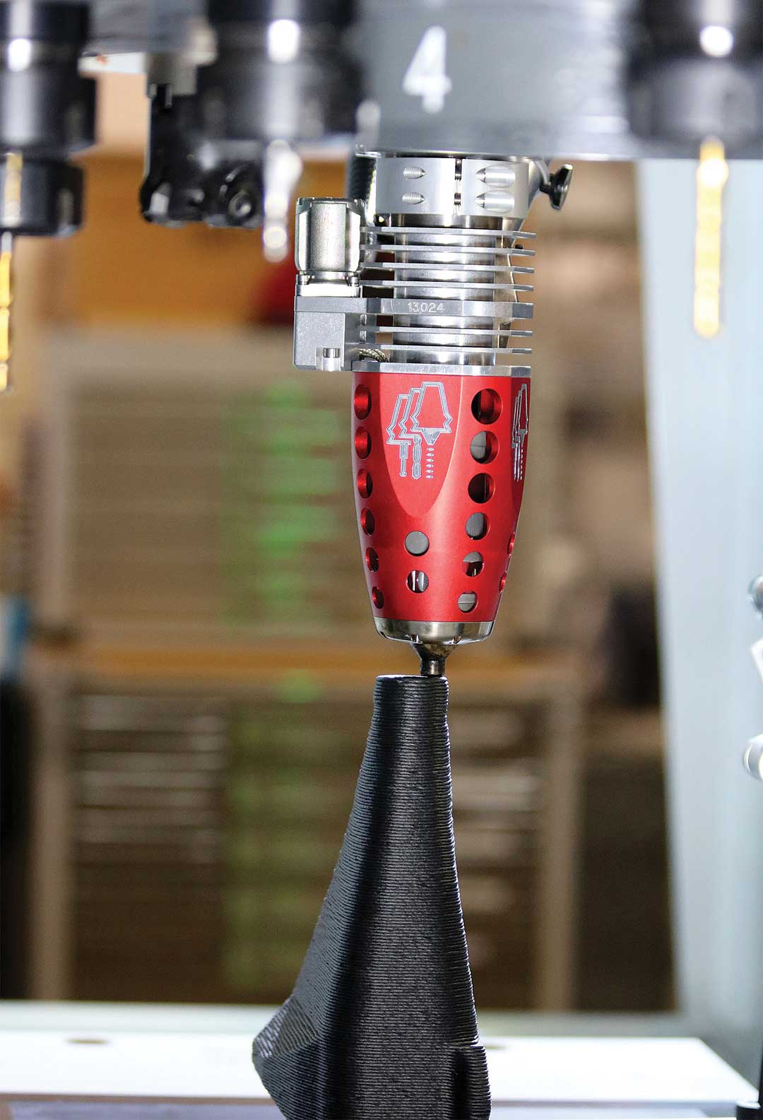 The AMBIT XTRUDE spindle-powered 3D printing head prints a polymer composite industrial separator component inside of a CNC machine. Areas of this part will be machined in the same set-up.