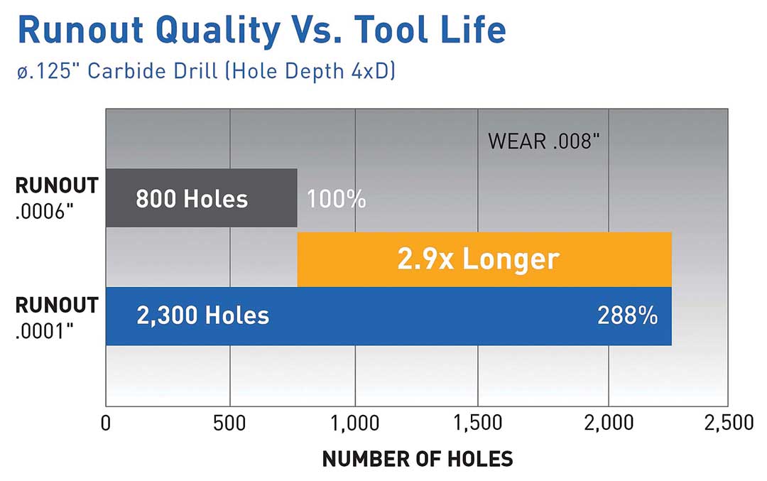 - Drilling tests with eighth-inch diameter carbide drills showed that at 80 millionths (just under .0001") of total indicated runout, we drilled 150 holes before reaching the wear limit.