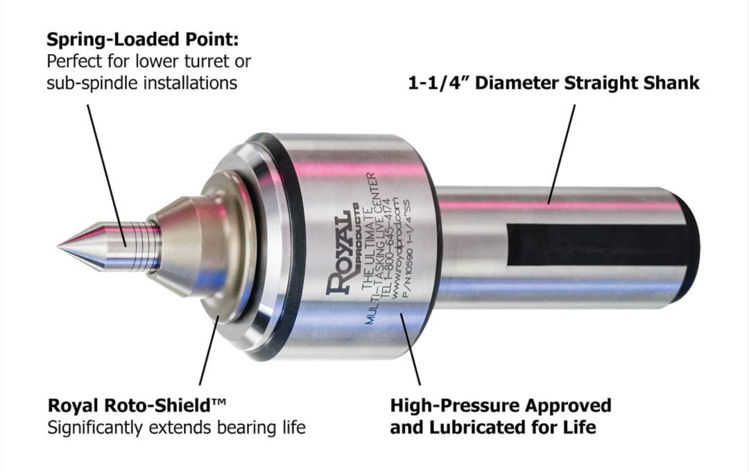 Royal Products has announced the Ultimate Multi-Tasking Live Center featuring Roto-Shield technology designed to significantly increase effective operating life and overall value. Designed specifically for use on the latest multi-tasking CNC machines with lower turrets and/or sub spindles, the Ultimate Multi-Tasking Live Center's spring-loaded point overcomes the lack of hydraulic compensation found on tailstocks, the company reported.