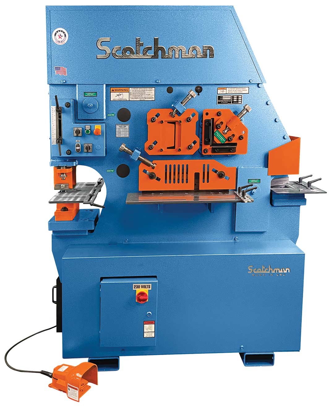 Built tough and engineered for performance, this American-made ironworker features a two-stage hydraulic pump system, electric valves, adjustable electric stroke control with scale, and a remote foot pedal for ease of use.