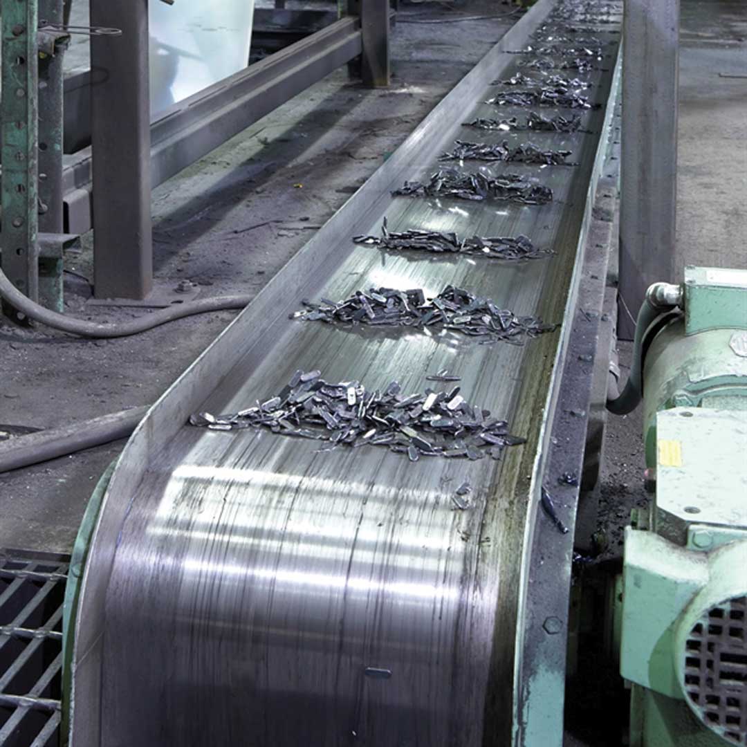 Eriez' permanent magnet conveyors use a continuous series of powerful ceramic magnets to pick up and glide material along the stainless steel slider plate. Material is then discharged over the head end. Because of their liquid-tight construction, lower conveyor sections can be completely submerged in coolant sumps or tanks. The working face is self-cleaning, and excess fluids drain easily back into the tank.